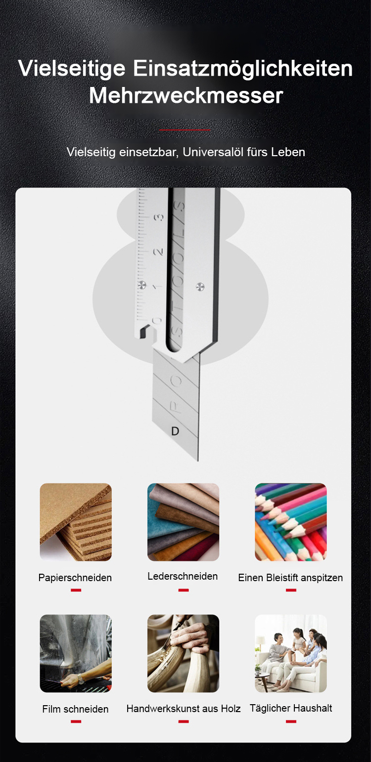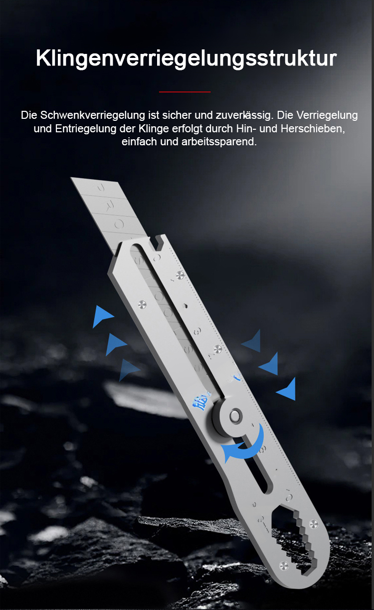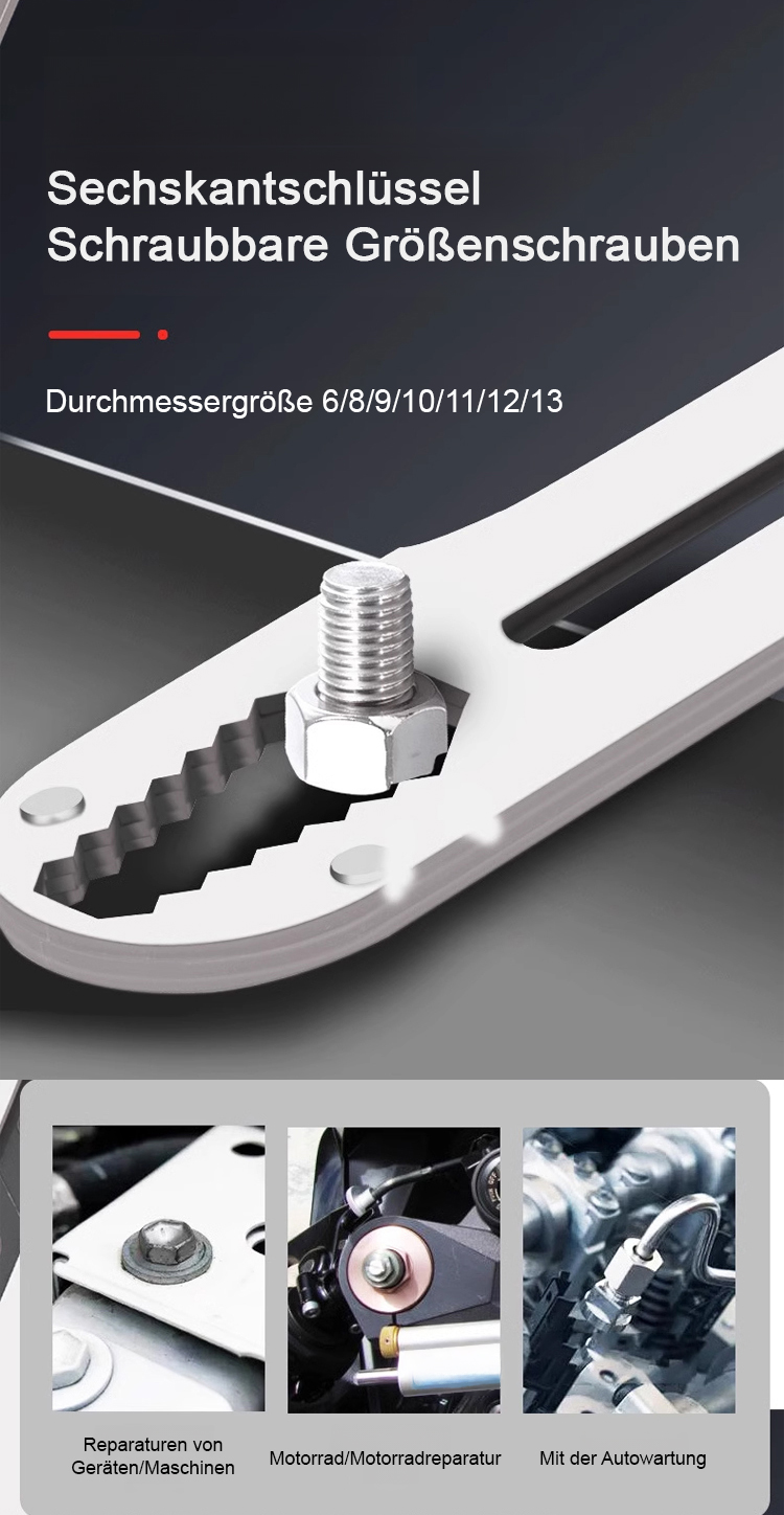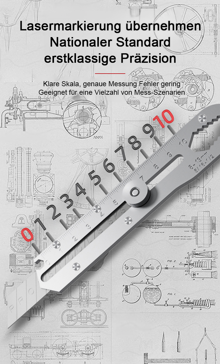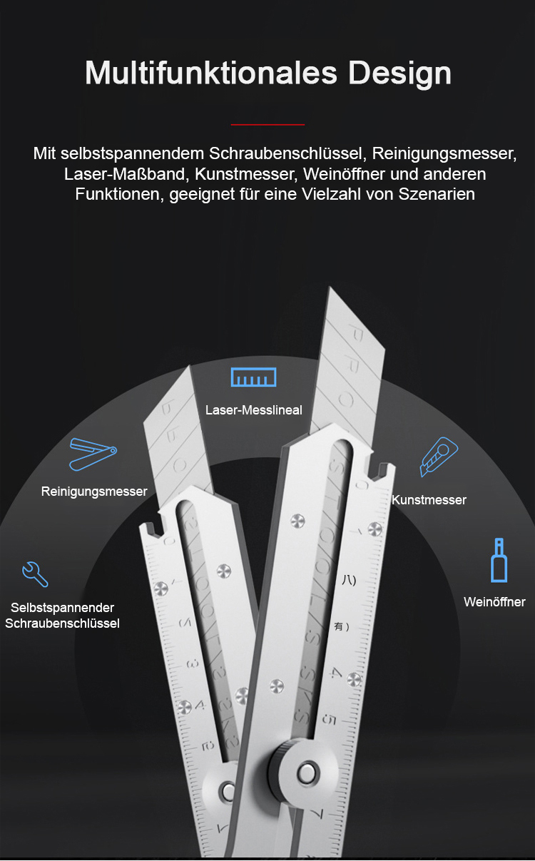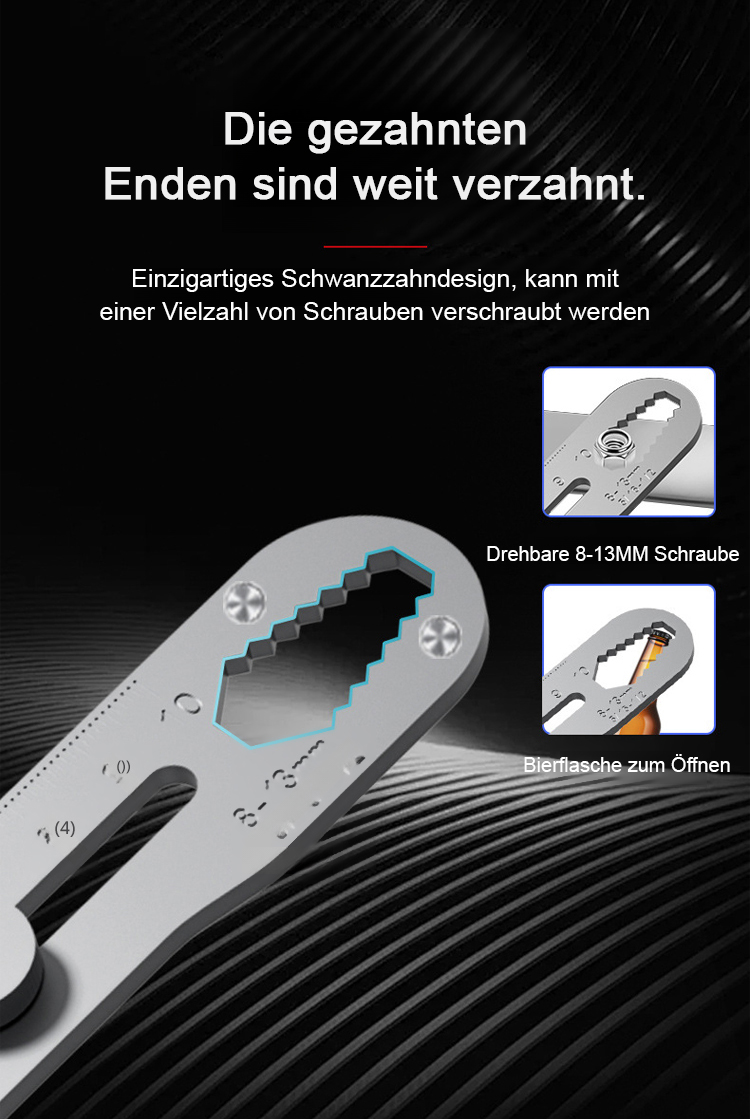 Ein Werkzeug, das 13 Kernfunktionen integriert, darunter ein lasergraviertes Lineal, einen adaptiven Ratschen-Schlüssel, einen Flaschenöffner und einen Drahtschneider!