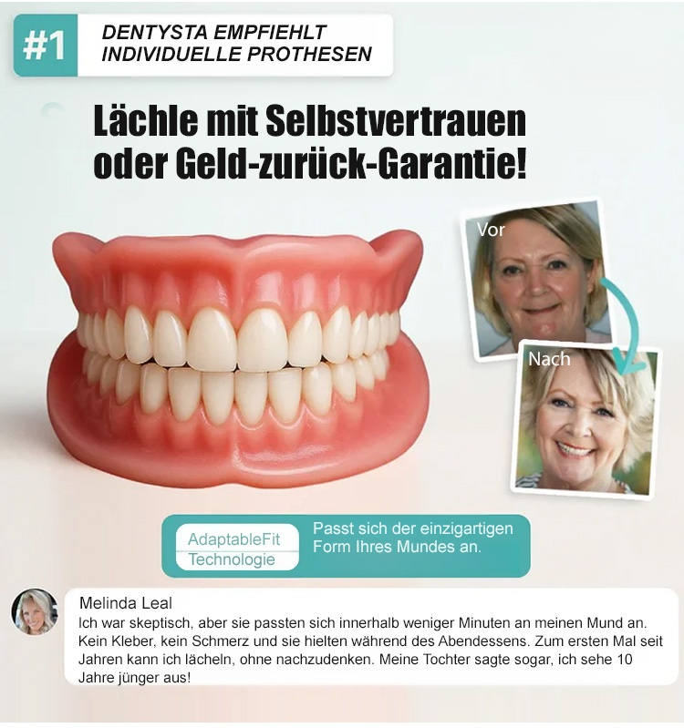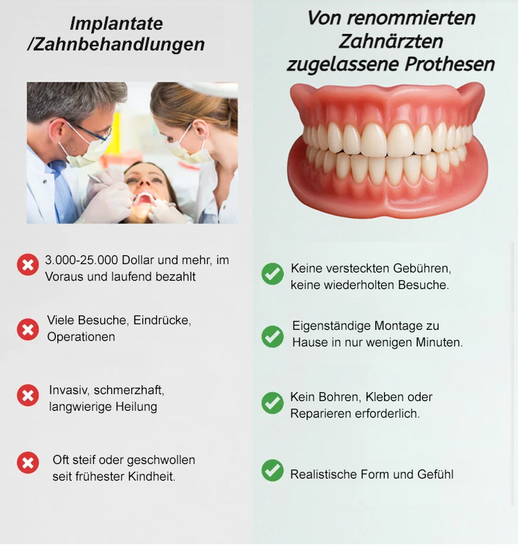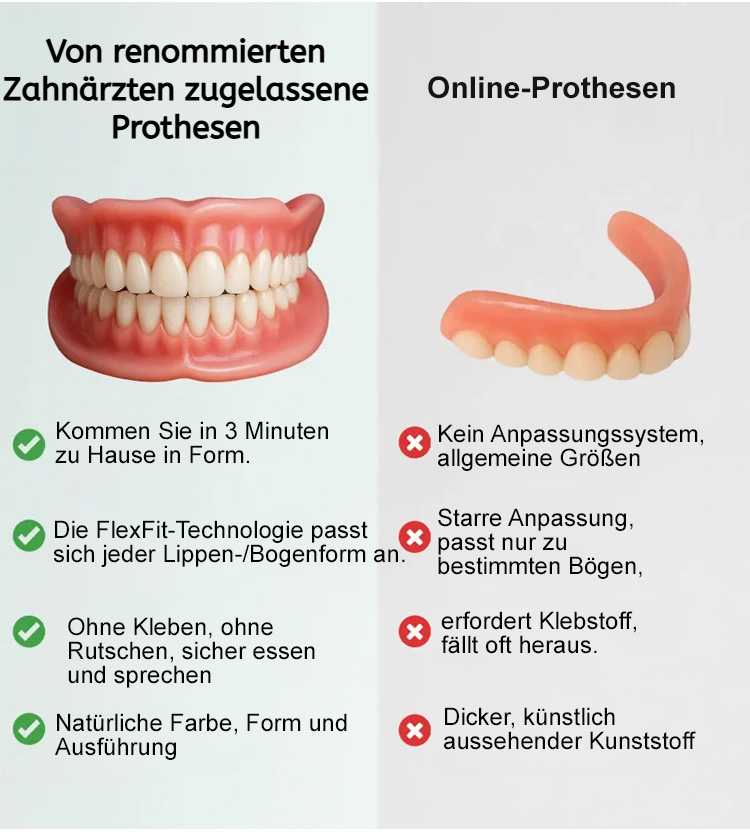 Passt perfekt zu Ihrem Zahnfleisch und sieht aus wie echte Zähne. Wenn Sie es tragen, verschwinden Lücken, gelbe oder beschädigte Zähne sofort, und Ihre Zähne werden sofort so strahlend weiß wie die eines Stars. Ihr optisches Alter reduziert sich direkt um 10 Jahre!