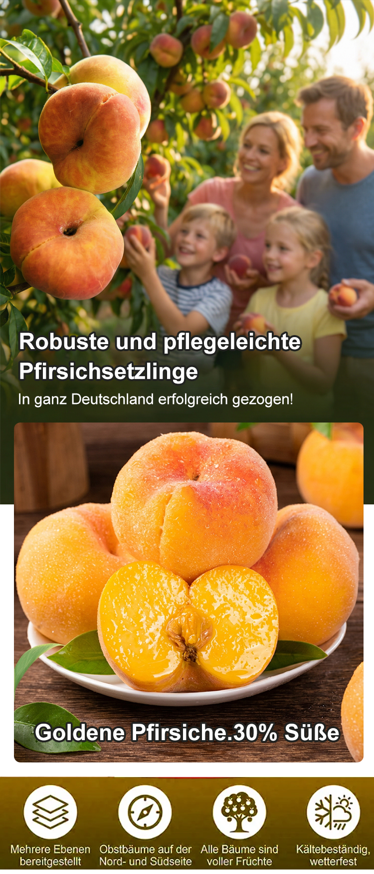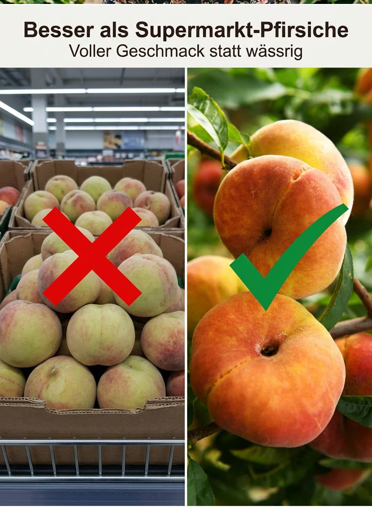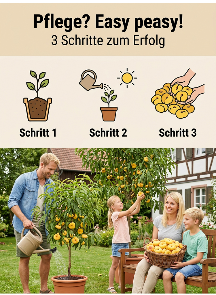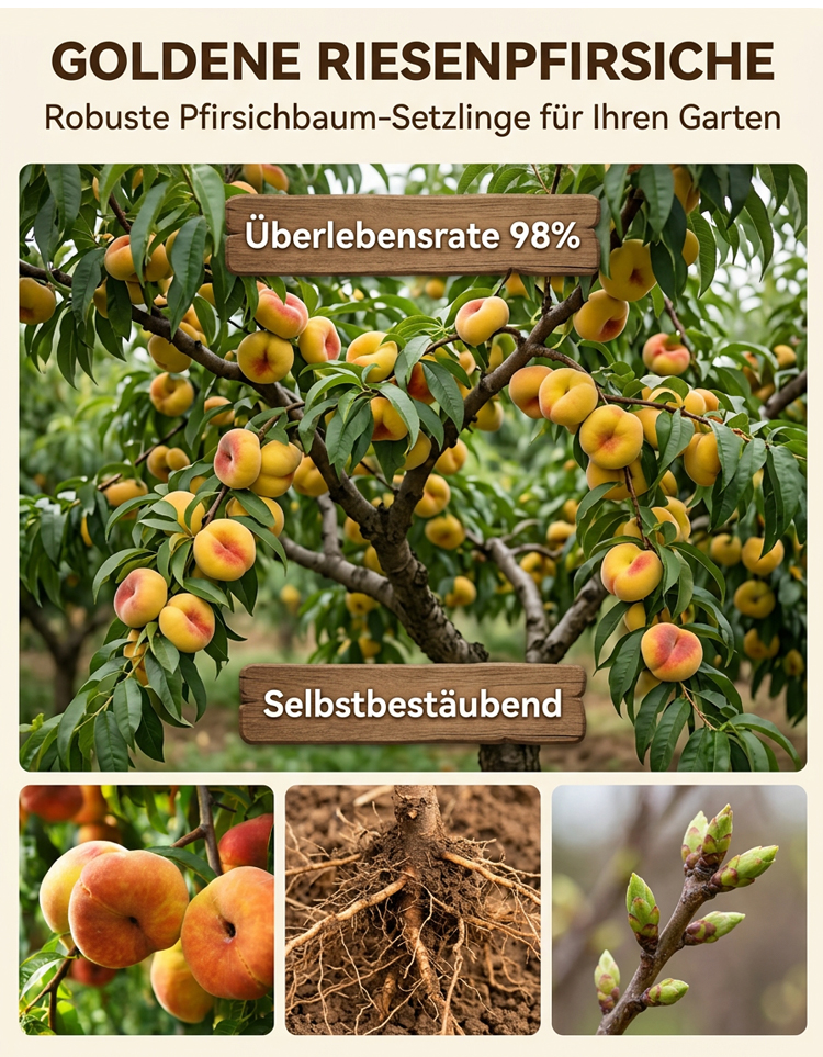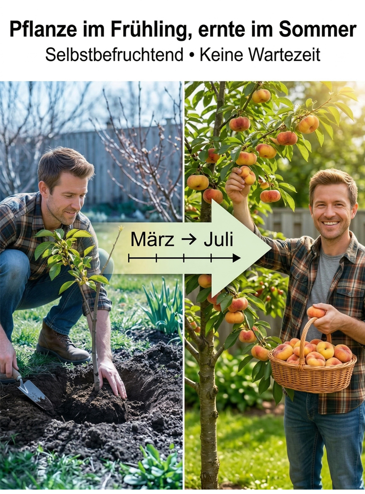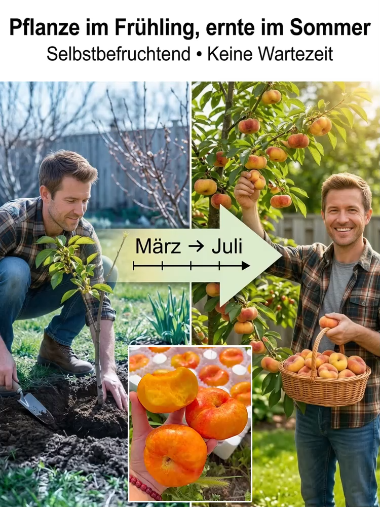 Ohne quälende fünf Jahre zu warten, wenn Sie jetzt pflanzen, werden die Bäume bereits im Juli dieses Jahres voller Früchte hängen. Einmal gepflanzt, trägt der Baum jedes Jahr Früchte und kann jährlich 50 Kilogramm gelbe Pfirsiche produzieren!