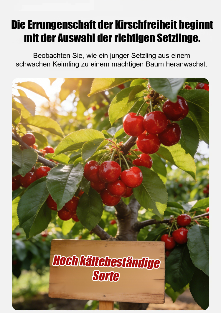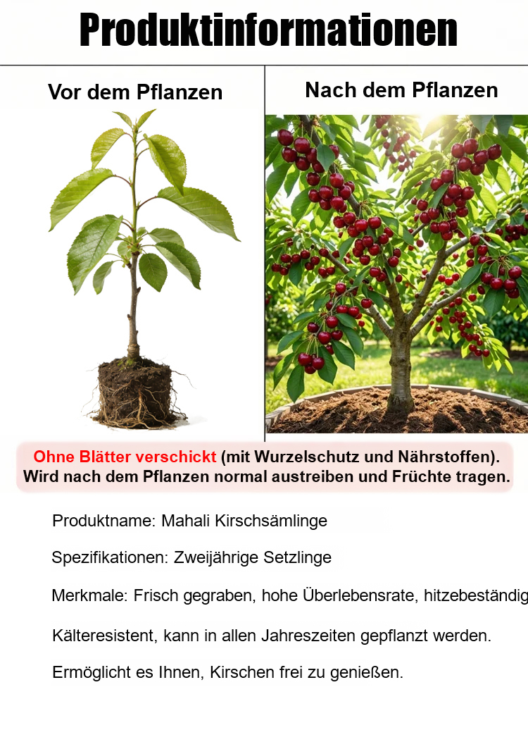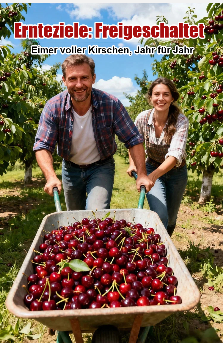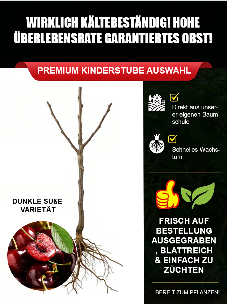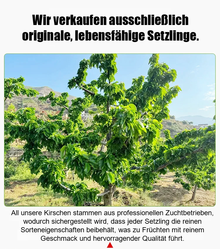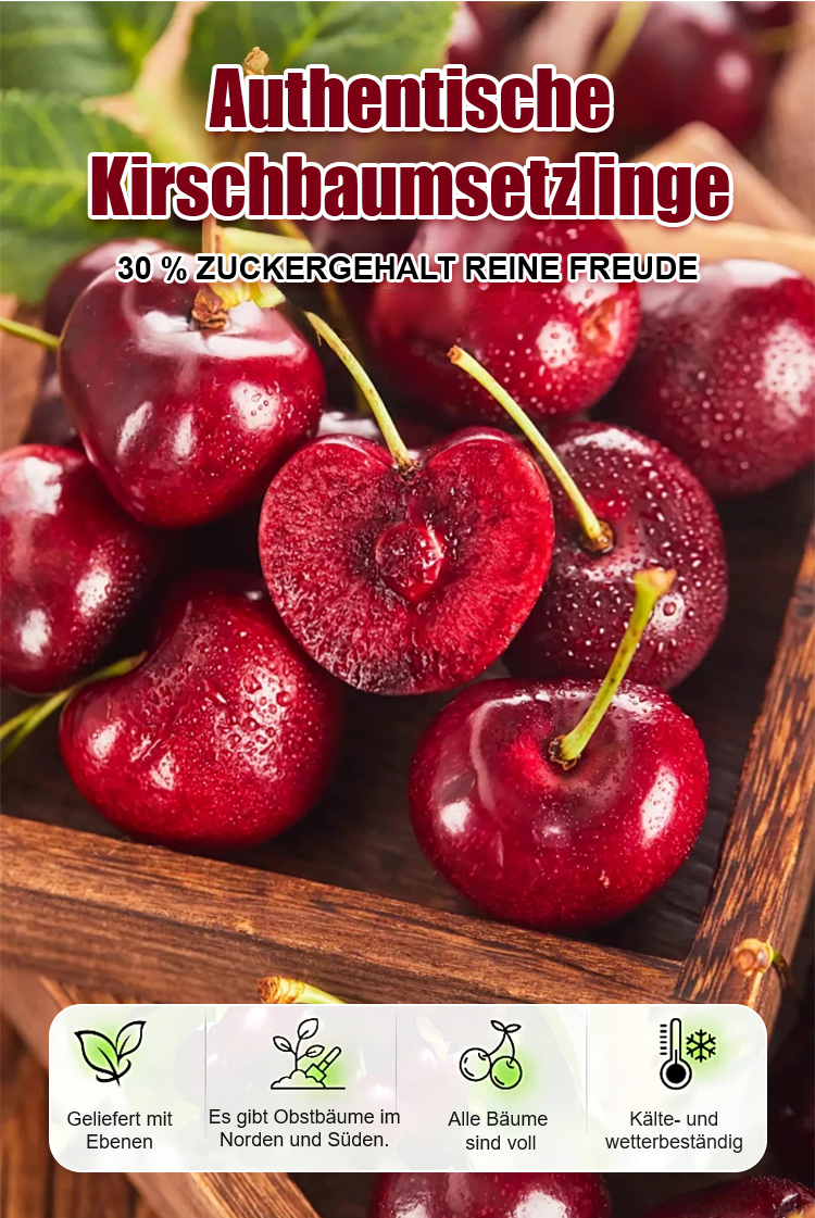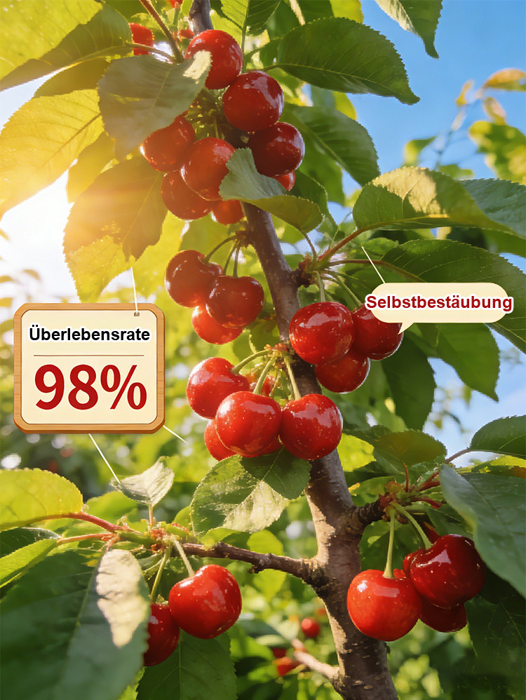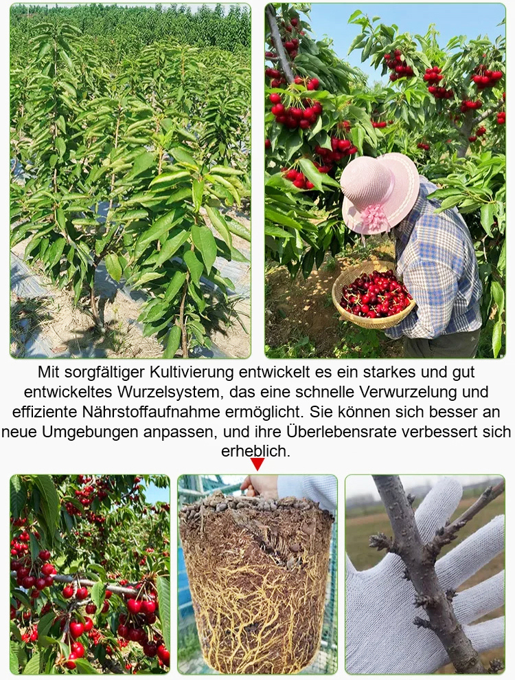 Geliefert werden kräftige, zweijährige Pflanzen mit äußerst entwickeltem Wurzelsystem. Wenn Sie jetzt pflanzen, können sie im Mai Früchte tragen. Ein Baum kann bis zu 50 Kilogramm riesige Kirschen in der Größe von Tischtennisbällen produzieren!