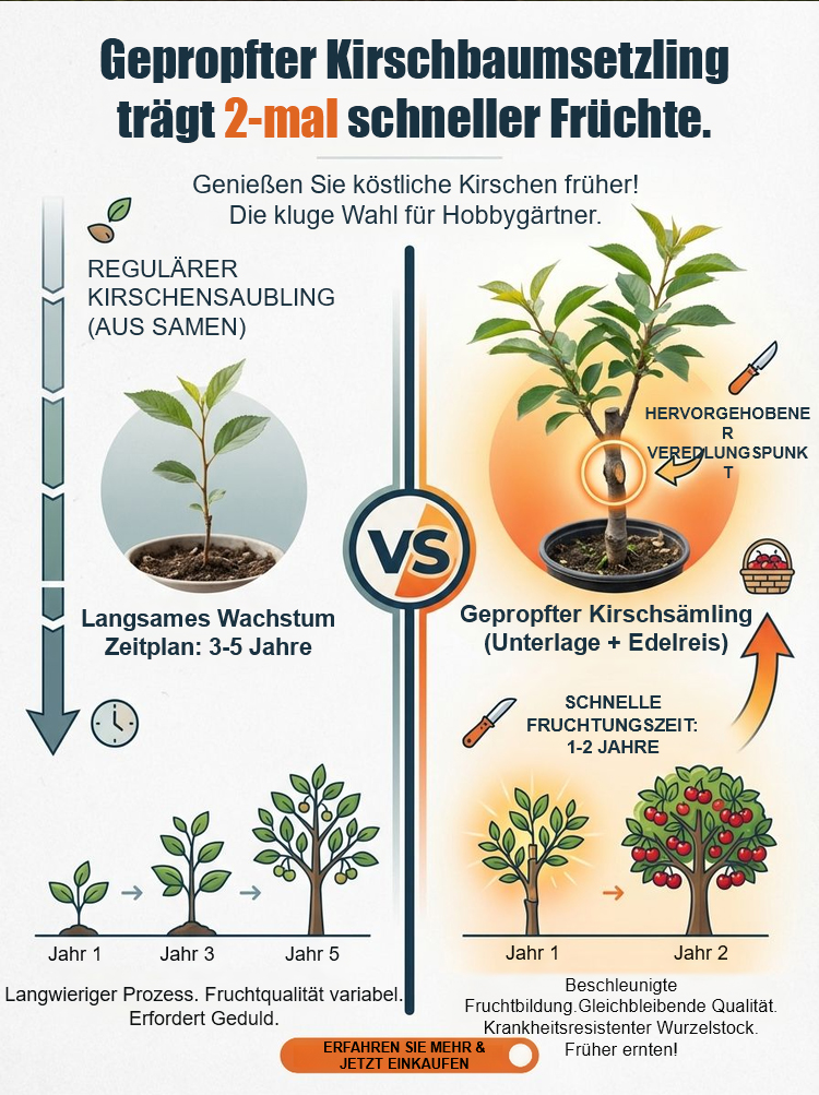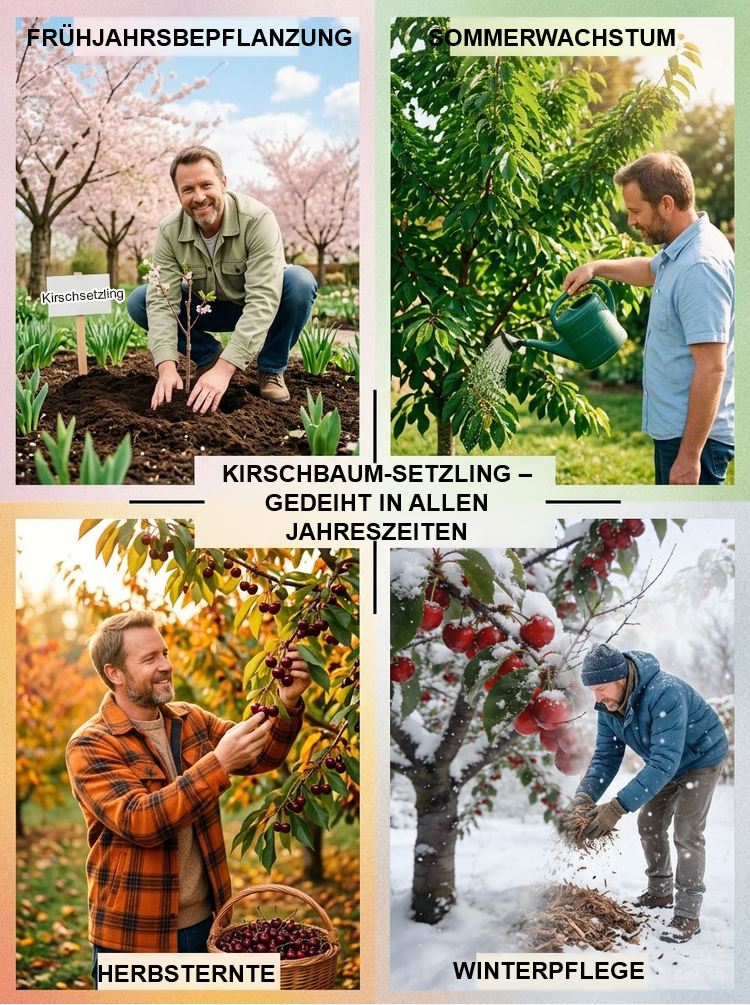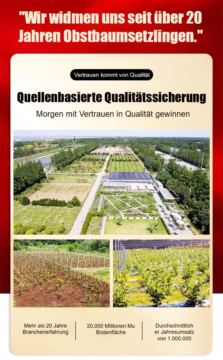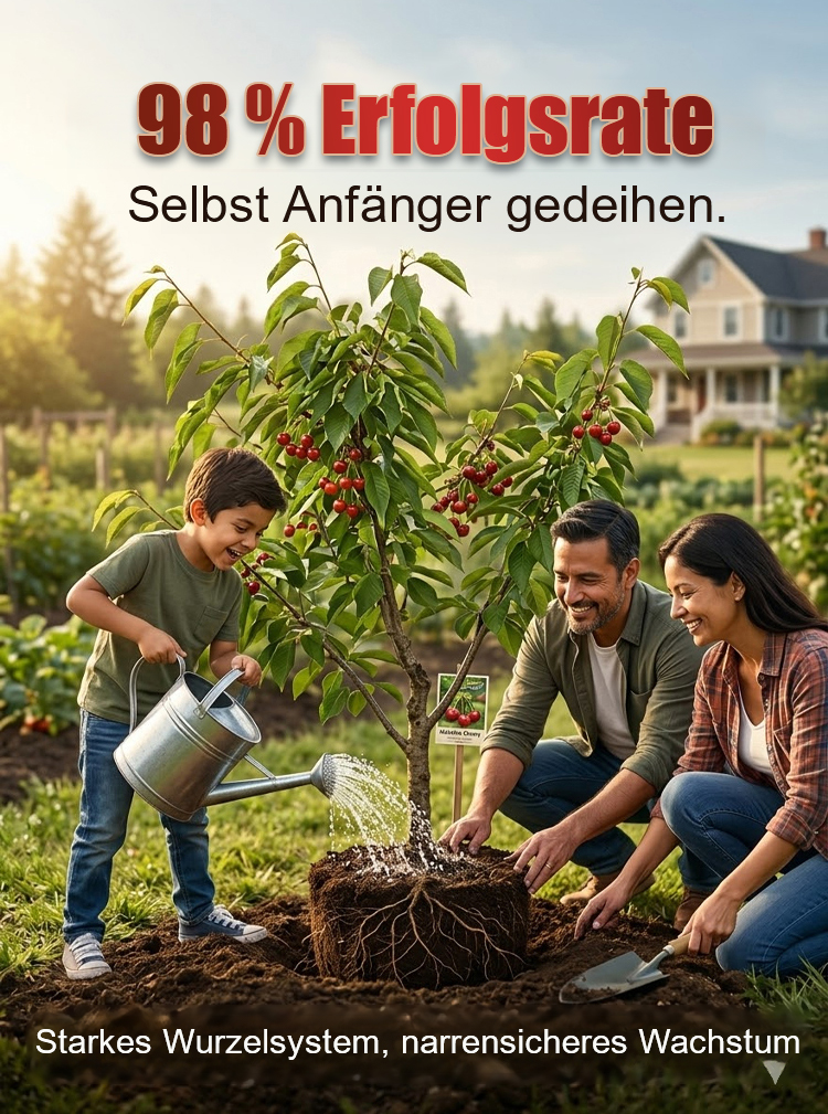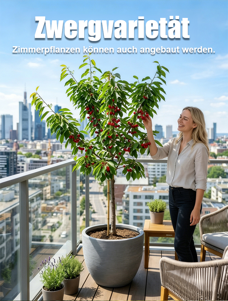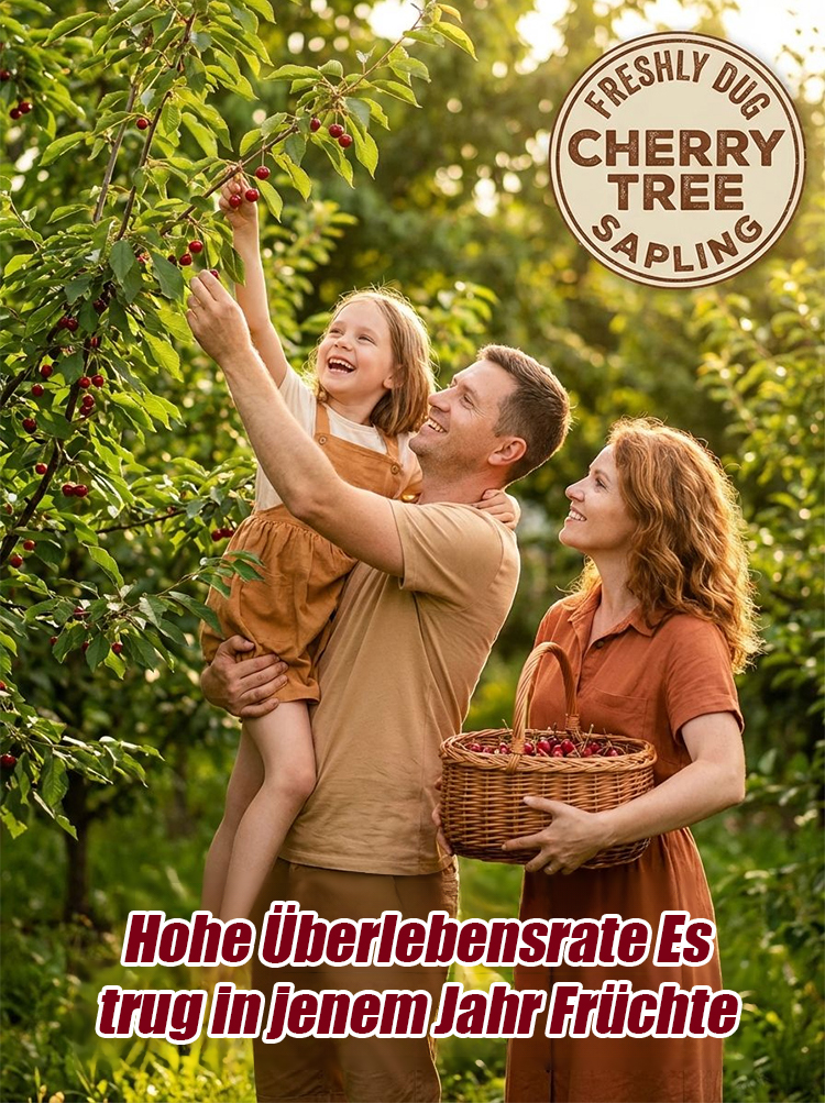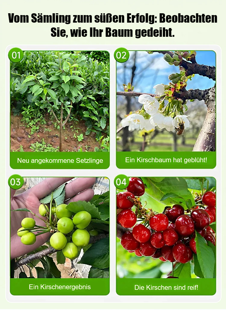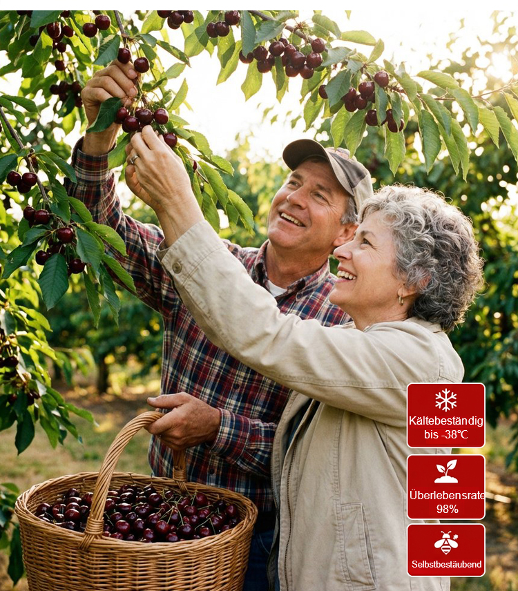 Geliefert werden kräftige, zweijährige Pflanzen mit äußerst entwickeltem Wurzelsystem. Wenn Sie jetzt pflanzen, können sie im Mai Früchte tragen. Ein Baum kann bis zu 50 Kilogramm riesige Kirschen in der Größe von Tischtennisbällen produzieren!