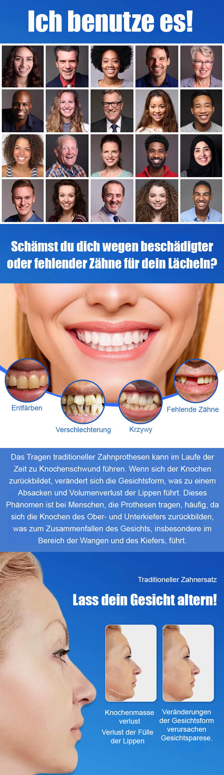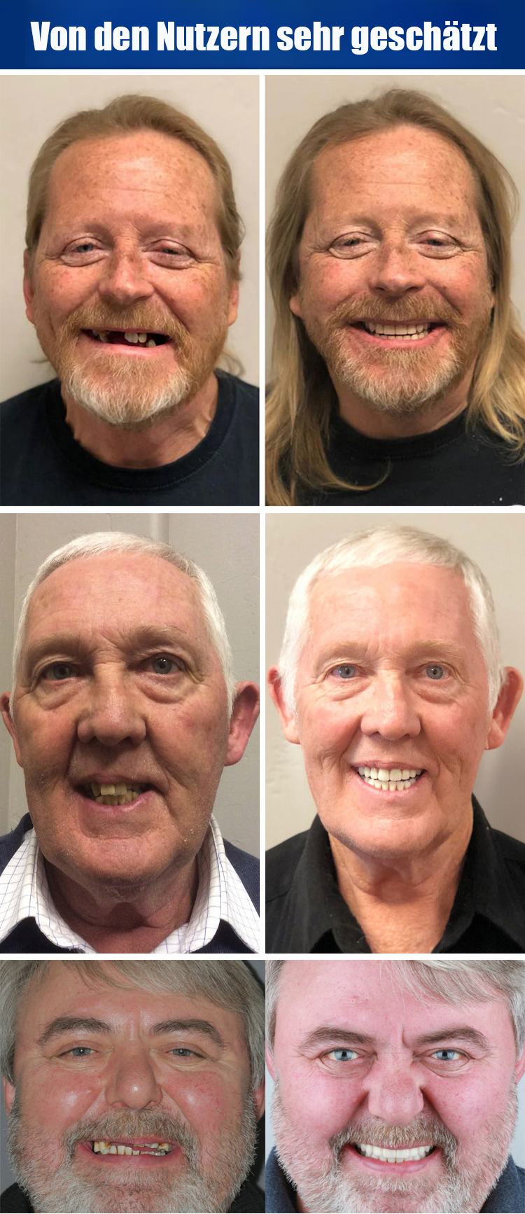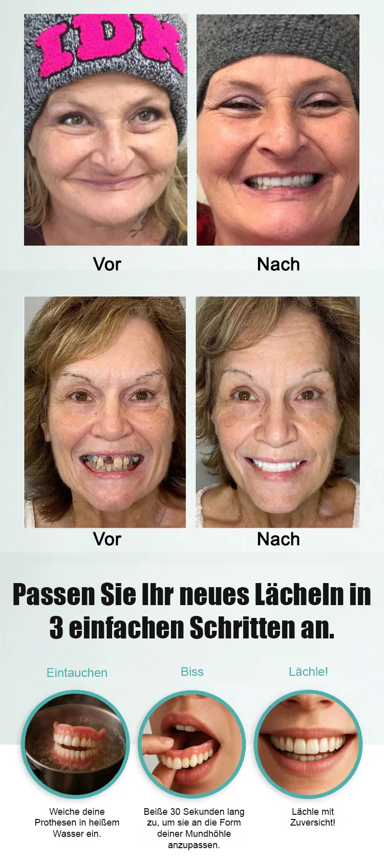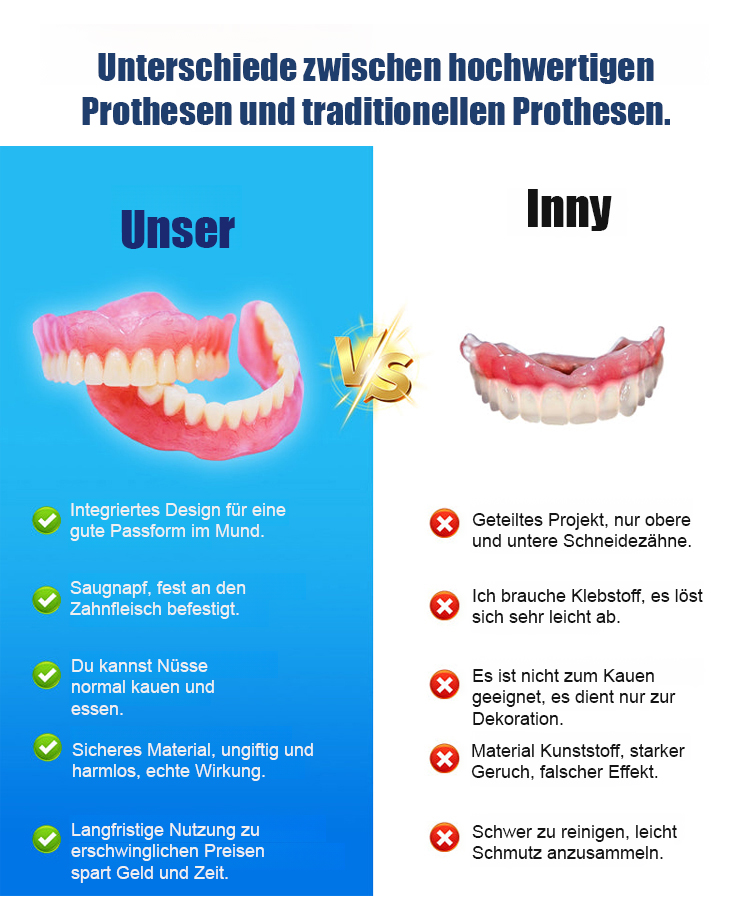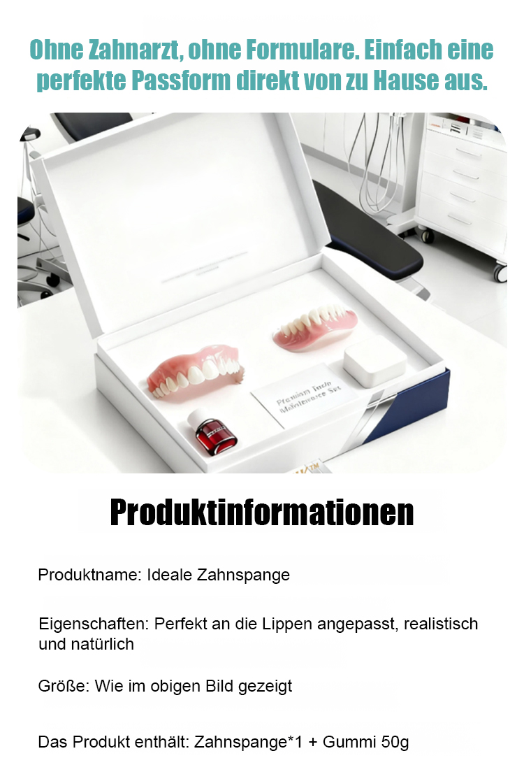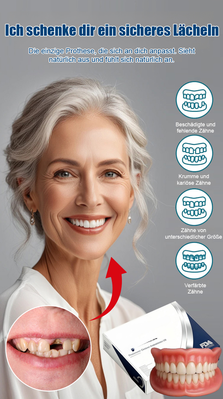 Passt perfekt zu Ihrem Zahnfleisch und sieht aus wie echte Zähne. Wenn Sie es tragen, verschwinden Lücken, gelbe oder beschädigte Zähne sofort, und Ihre Zähne werden sofort so strahlend weiß wie die eines Stars. Ihr optisches Alter reduziert sich direkt um 10 Jahre!